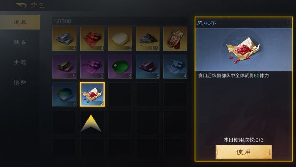 30.五味子可囤积,以备不时之需每位玩家每天只能接受一次青囊的赠药,而每日最多可使用3枚五味子,同盟战争爆发前建议囤积一些,有需要时再一次性全部使用。同时如果头衔已经快升级的情况下,建议在头衔升级后再使用炼药技能,可以获得更好效果的丹药。