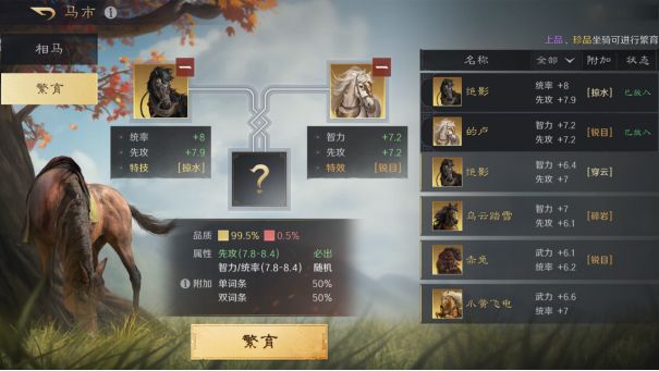 繁育坐骑有机会获得“绝世名驹”,其拥有更高的属性值。但要注意参与繁育的两匹坐骑会消失。