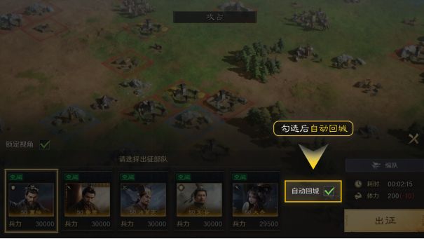 派出部队时,可以自由选择是否“自动回城”,各位可以视情况和效率而定,选择勾选“自动回城”。