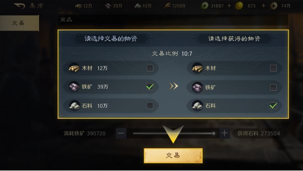 当部分资源爆满,但某个资源急缺的时候,可以利用集市的资源交换功能,换取短缺的资源。但是无法通过资源交换来获得粮食。