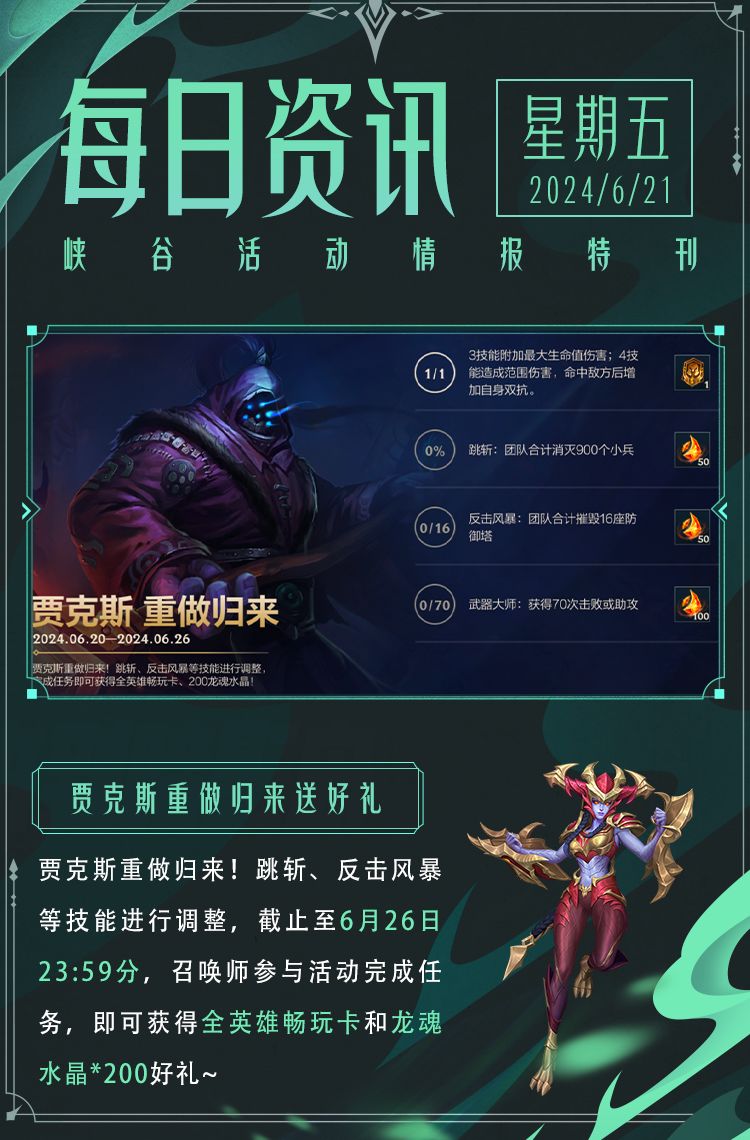 奖励:天赋觉醒系列皮肤,玉剑传说 苍鸾 莫甘娜,神龙守卫 加里奥,全英雄畅玩卡,7天随机皮肤宝箱,双倍晶石卡,龙魂水晶*88