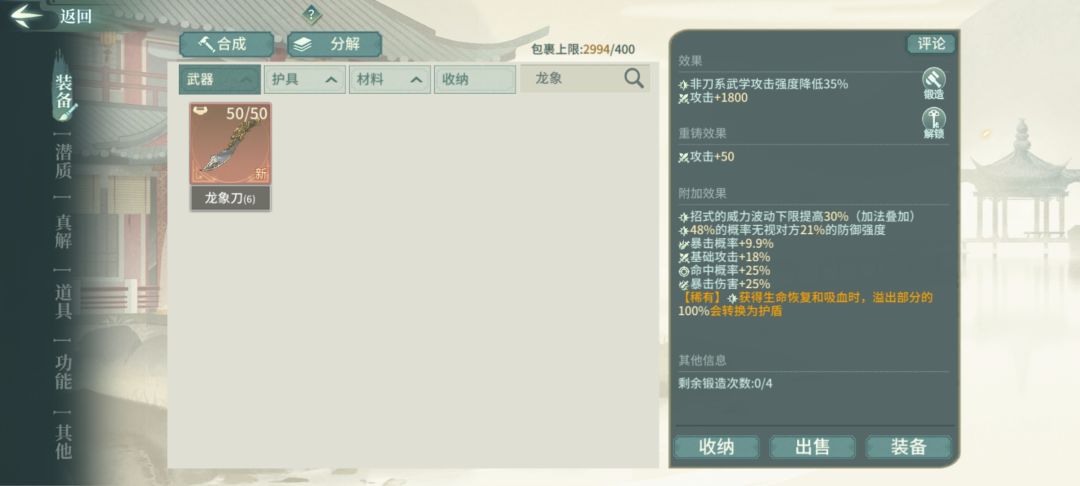 进入关卡即服食“仙灵琼露”,因龙象刀稀有词条可获得与血量、回复、护盾加成相关的高额护盾;