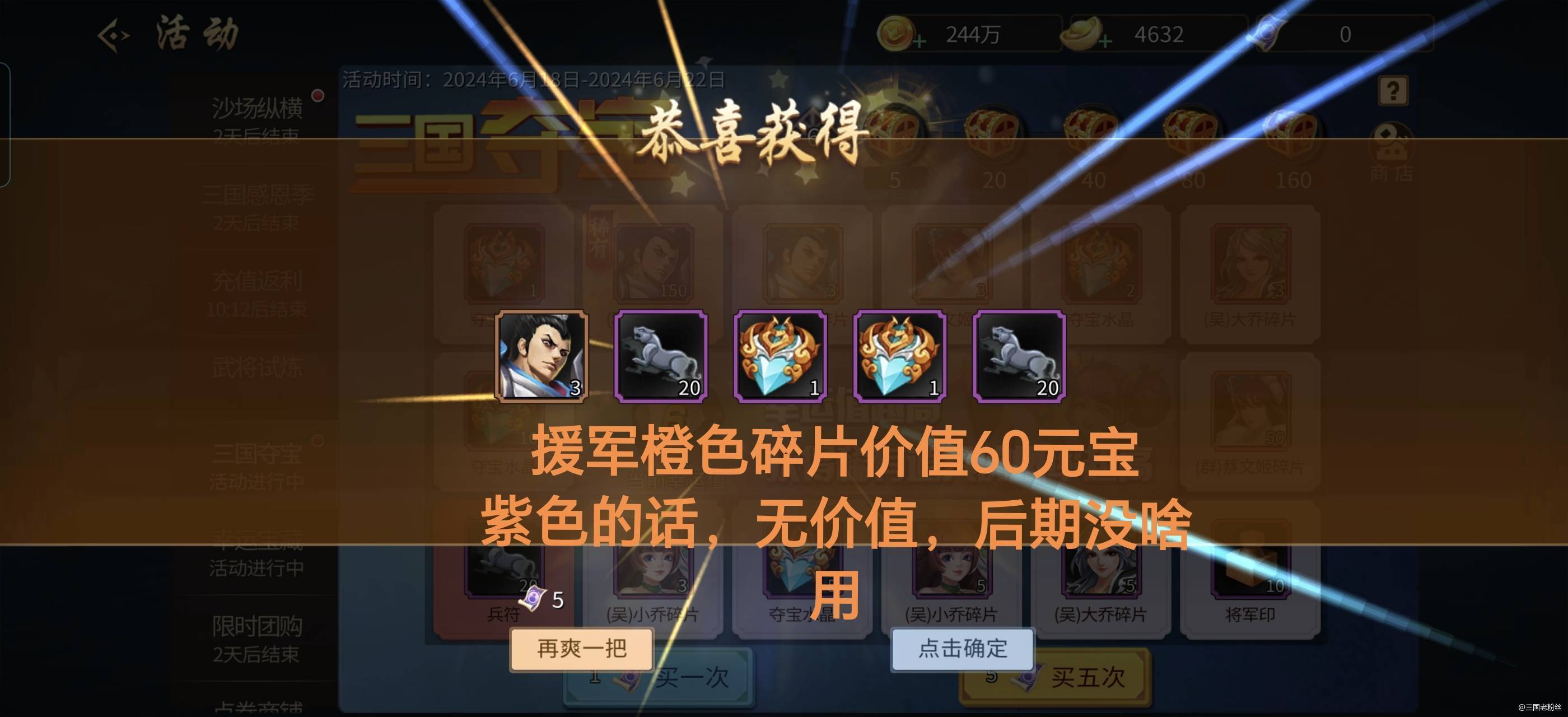 如果运气好,弄到10个水晶,或者50蔡文姬就赚大了,所以每次夺宝可以小玩一下,别多玩,1次或者4次即可,这也是传说中的乌龟玩法。