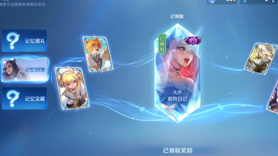玩家可以通过记忆赠礼来获得记忆碎片,利用记忆碎片,就可以刷新记忆回馈的奖励,刷新的次数越多,奖励也就越好,最高可以刷新出史诗皮肤。在体验服,记忆回馈可以刷新出大乔的猫狗日记、安琪拉的时之奇旅等高质量的史诗皮肤。