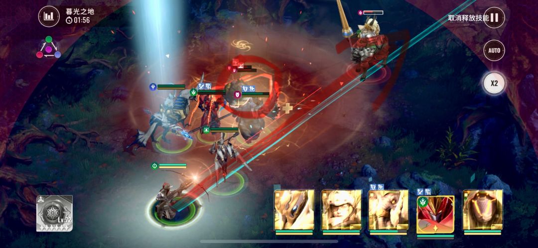 图5/图6第二种阵容:羁绊 全职业。先锋吕布/灵能泰厄斯,能量技将前排小怪聚拢在靠边位置,疾射阿利萨/希卡里的能量技能从拉扯出的角度输出到后排人马