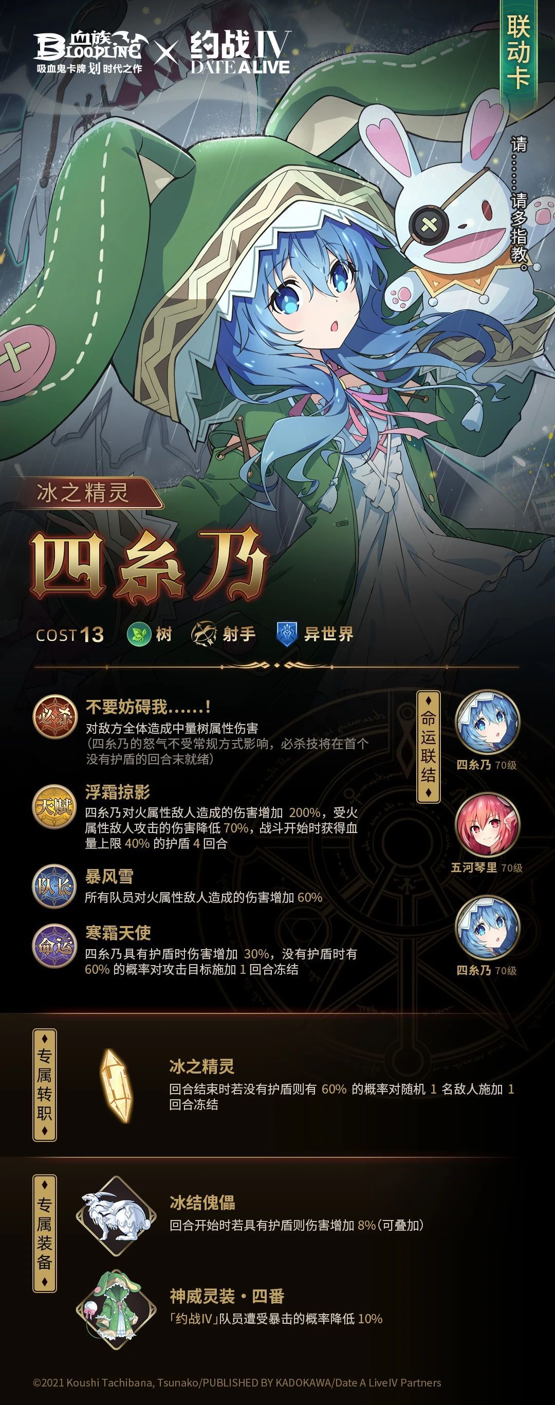 冰之精灵,识别代号〈隐居者〉。长相宛若法国娃娃般美丽的蓝发少女,有着梦幻般的外貌和娇小的身材,外表年纪与五河琴里相近。生性温驯而胆小怕生,几乎不敢与人直接对话,而她手上的朋友“四糸奈”却截然相反,爱开玩笑,拥有相当开朗的个性。