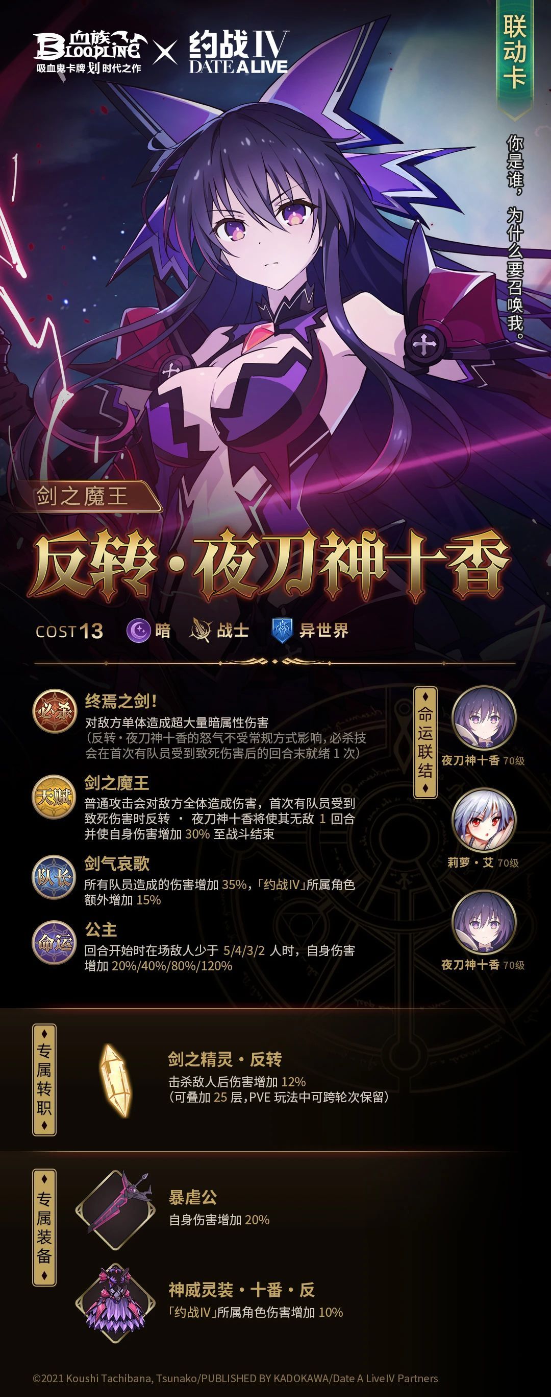 反转后的夜刀神十香。身穿着黑色灵装,性格高傲冷酷,拥有着与普通十香完全不同的独立人格。