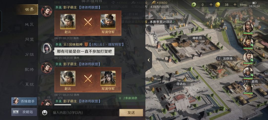 当然,定睛一看影子萌主在世界公屏分享的战报,立马就感受到了他的高超配将技术。43级的赵云、黄月英和徐庶,把48级的许褚队和郭嘉队轻松拿下,军演守军那么多的兵力怎么就拗不过他们呢?