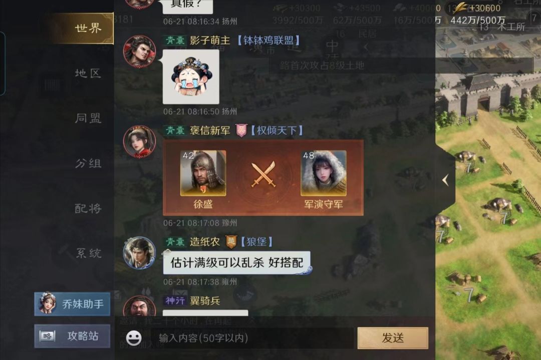 首日送的徐盛,堪称三国谋定天下的龟壳一哥,再把大乔组上,即便没有孙策加盟,随便搭个打手都能算得上一线开荒队伍。不过俗话说得好,高手总是在民间,本期的主角是一位名叫褒信新军的兄弟,他在世界公屏上分享了自己的创意组合。