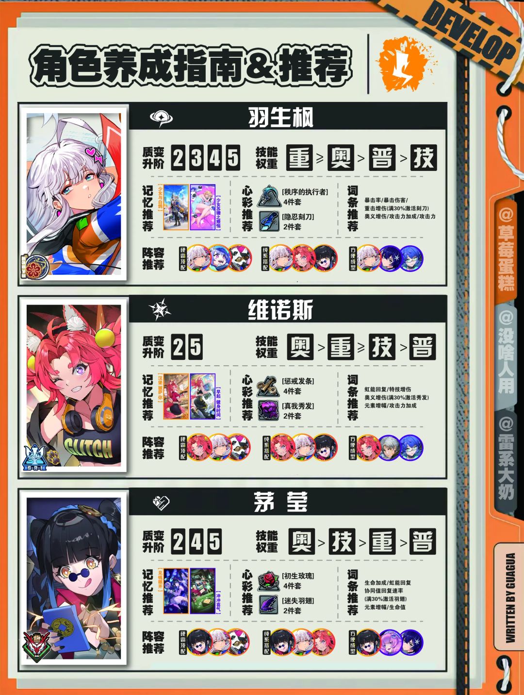 本期我们的瓜瓜大佬给大家带来了四系的角色配队攻略以及养成攻略,大家跟我说:谢谢瓜瓜