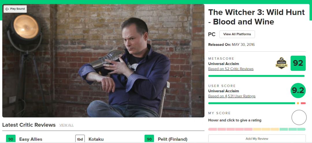 过去8年一直无人突破的最高分记录是92分,由《巫师3》DLC“血与酒”保持