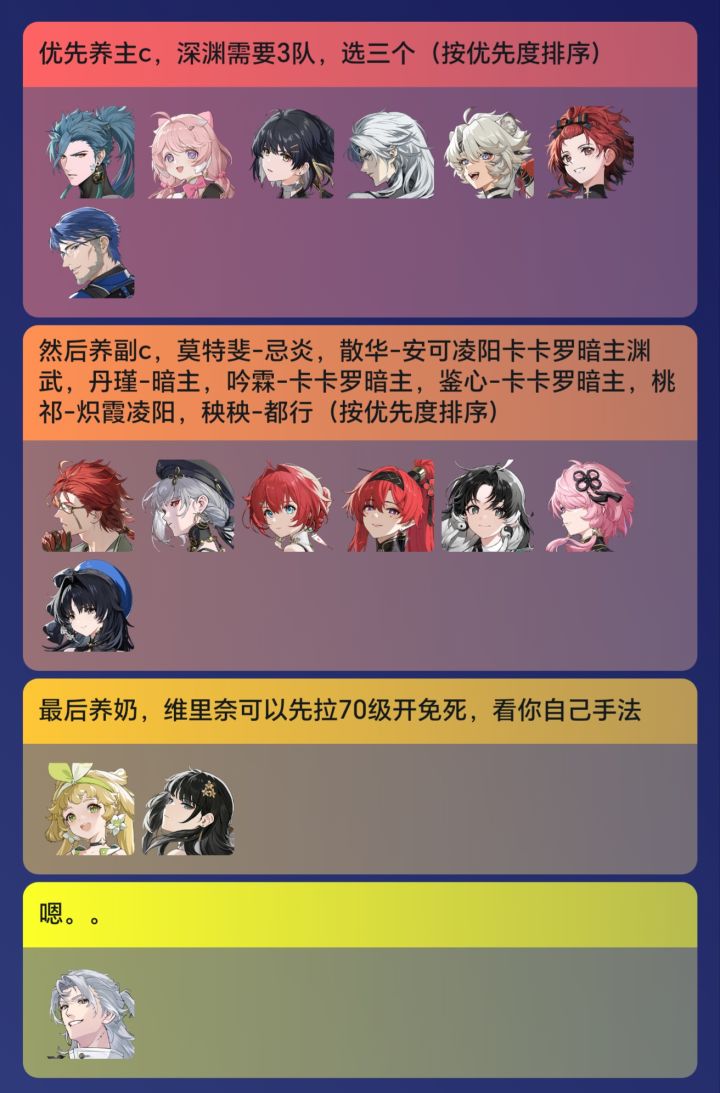 副c一开始是想对应主c排的,发现有的副c比较百搭,不好排,又想着按优先度来排也没排好,不过也差不多,吟霖优先应该高点,莫特斐没忌炎不练
