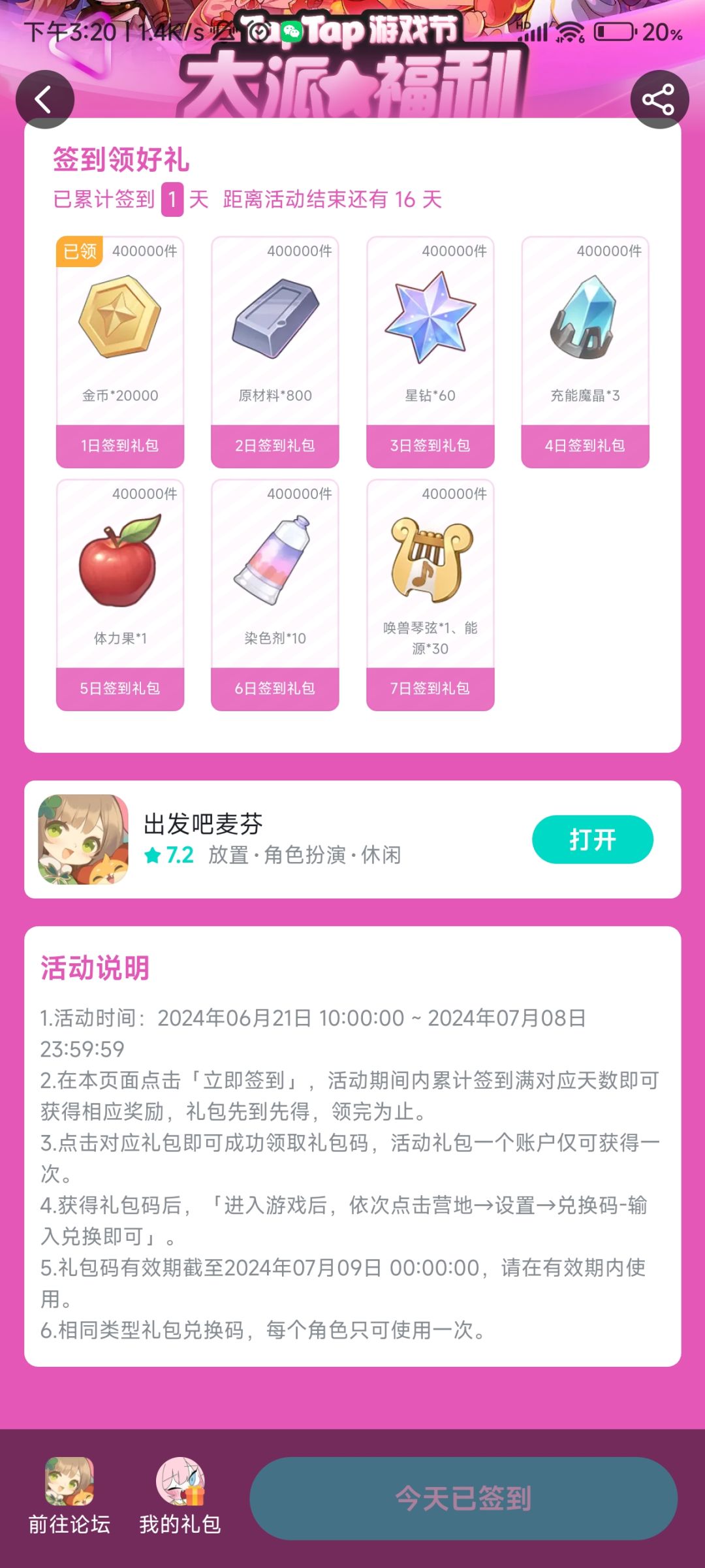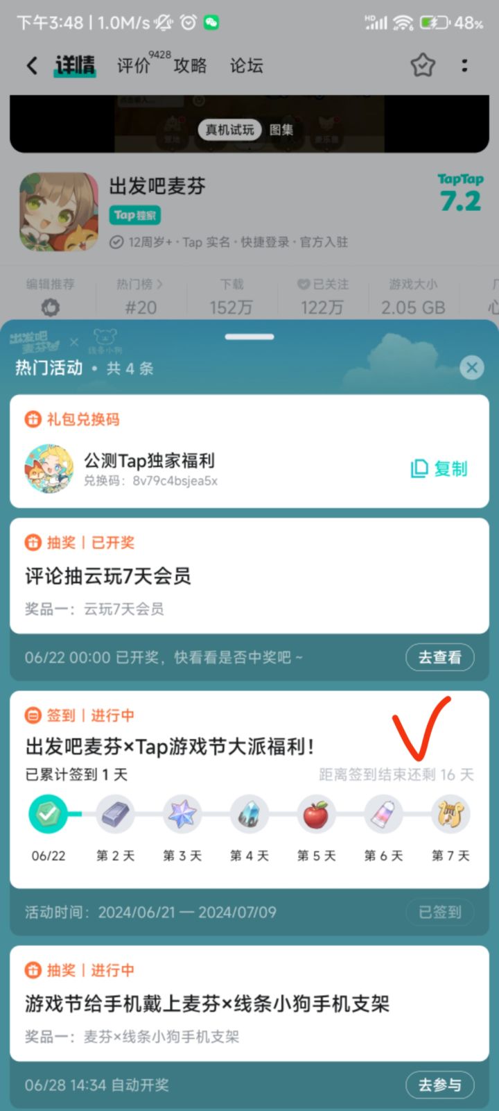 4、tap又又又更新签到送兑换码了兑换码:mfdashu
