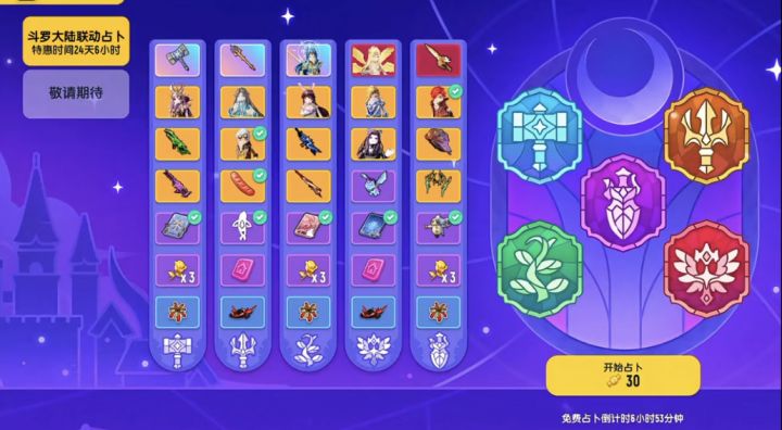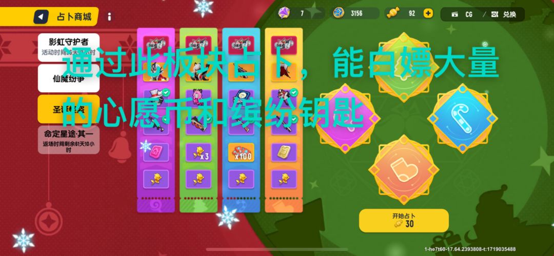 建议大家通过圣诞怪盗这类板块占卜,来白嫖大量的心愿币和缤纷补给箱钥匙。耐心好,还能白嫖到红色品质的联动皮肤。