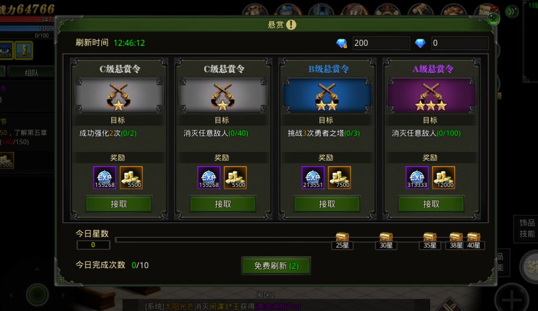 每日接取悬赏令,星数越多,难度越高,对应的奖励越高。