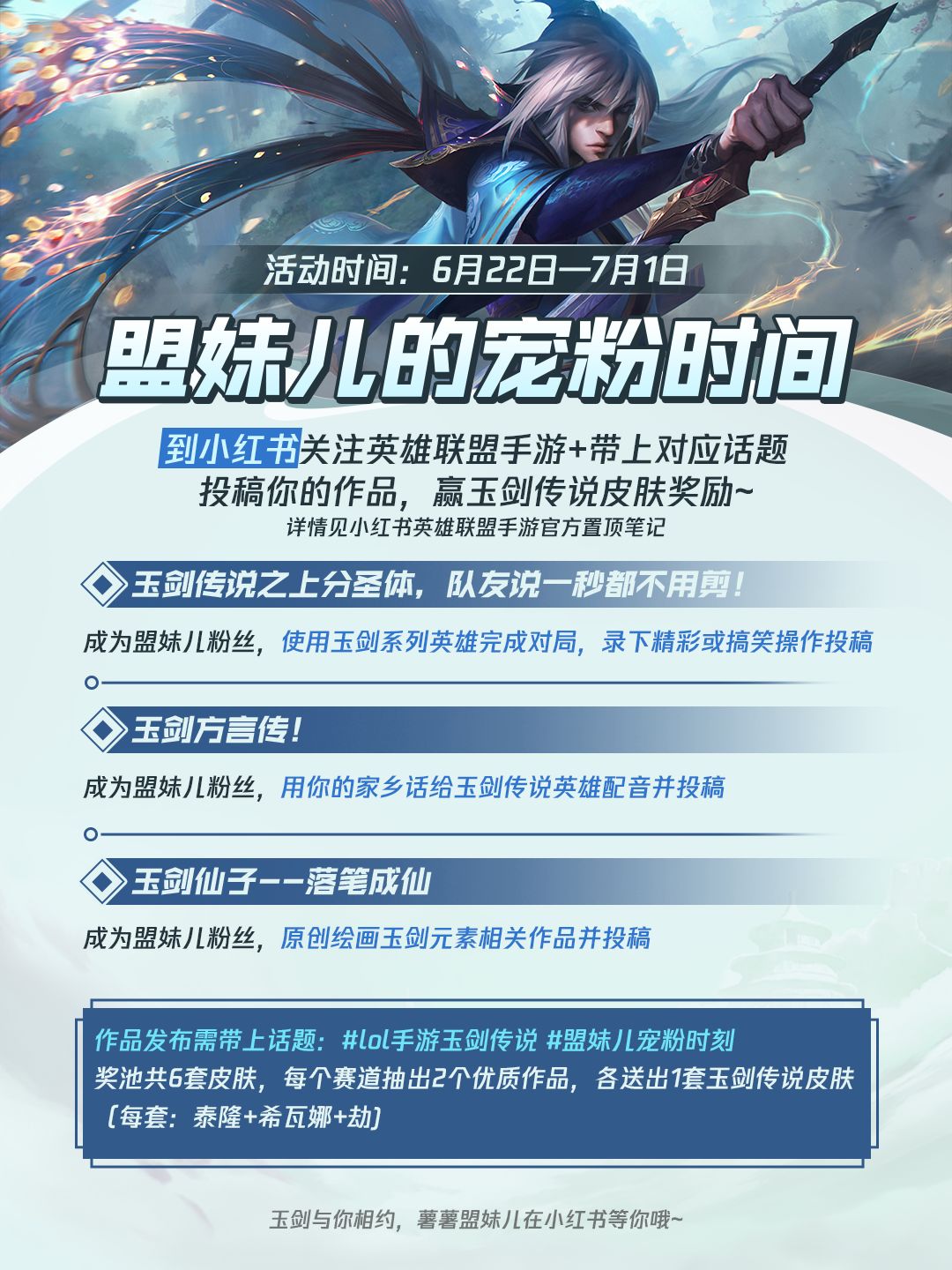 6月22日至7月1日,召唤师可以前往小红书英雄联盟手游官方平台,参与玉剑传说小红书征稿活动,按活动要求进行投稿,6套玉剑传说皮肤等你来拿!
