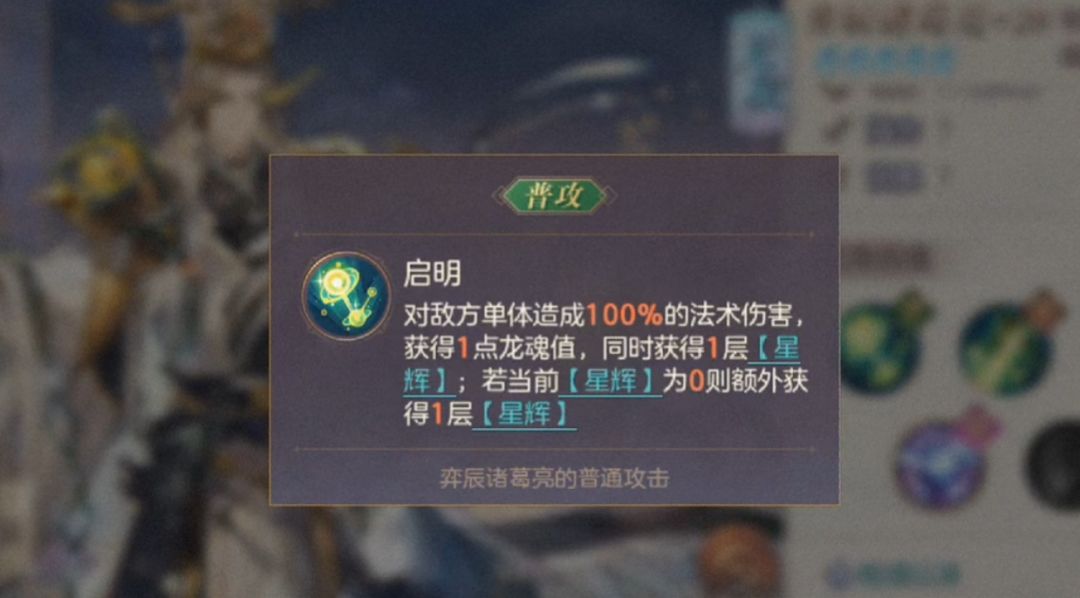 启明:恢复一点龙魂值,获得一层【星辉】,若当前【星辉】为零则额外获得一层。【星辉】效果:当有七层时,会立即释放怒攻
