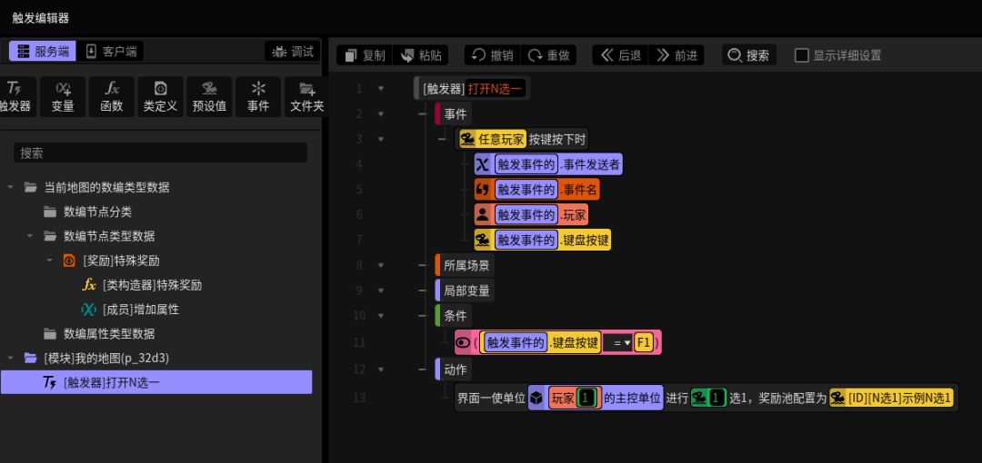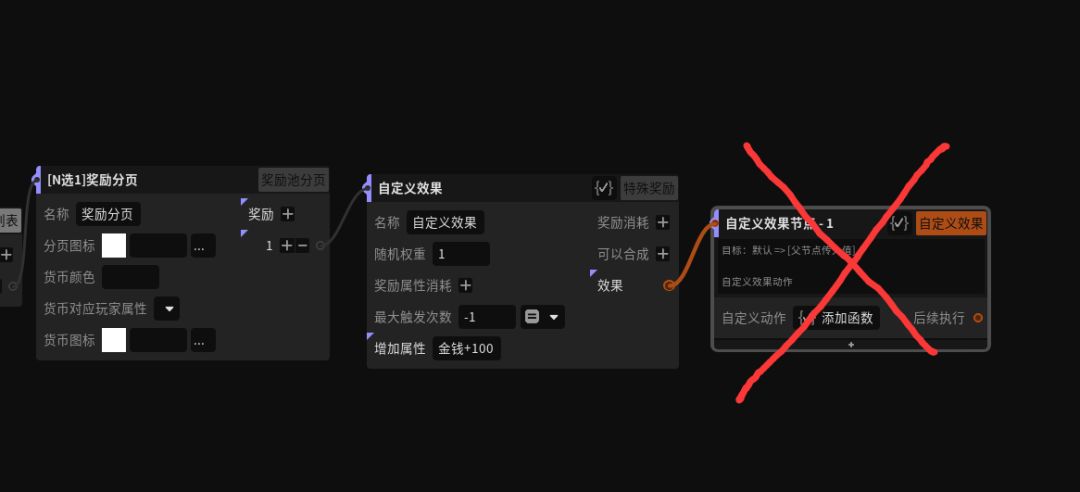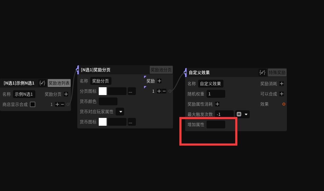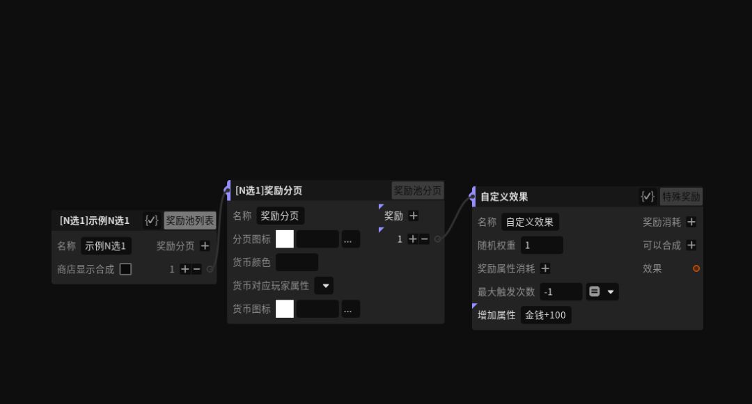 就拿N选一举例,用官方N选一预设后,假设奖励是一些比较复杂的,一般用自定义奖励,后面连接一个自定义效果。