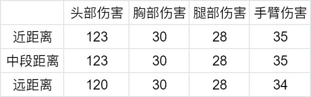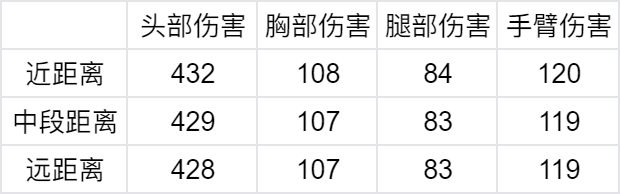 AWM–蜂鸟以AWM-A外观为原型,伤害方面与AWM对比一致,不过护甲系数为0.9,稍微弱于AWM。主弹匣比AWM多5发,移动速度高1点,且受击上抬高度为0.12,开镜受击上抬高度相较于AWM优化到了6。具体测试伤害如下图,以靶场为例。
