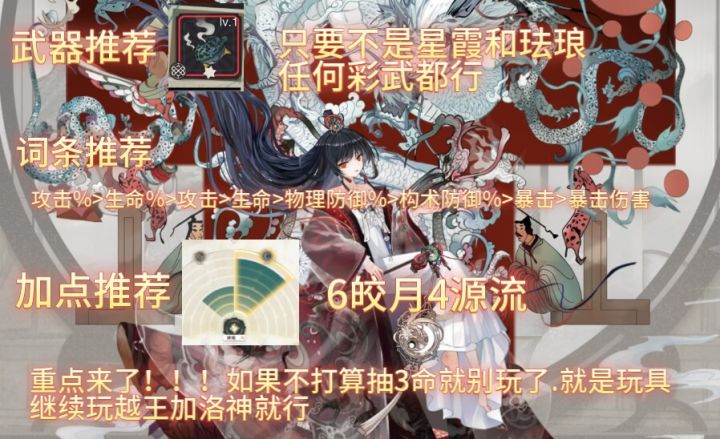 我这里不是很推荐0命去玩,0命5➕5能玩但是真的不如3命,抽到3命简直就是另外的人物,伤害高的很,有条件的可以去追满命绝对不亏信我,你很喜欢可以抽来当看板,然后有越王的可继续去练,我这里后悔没抽香囊呢,因为可以大幅度提高t形伤害,还有t形要的是攻击别在傻傻去刷暴击了