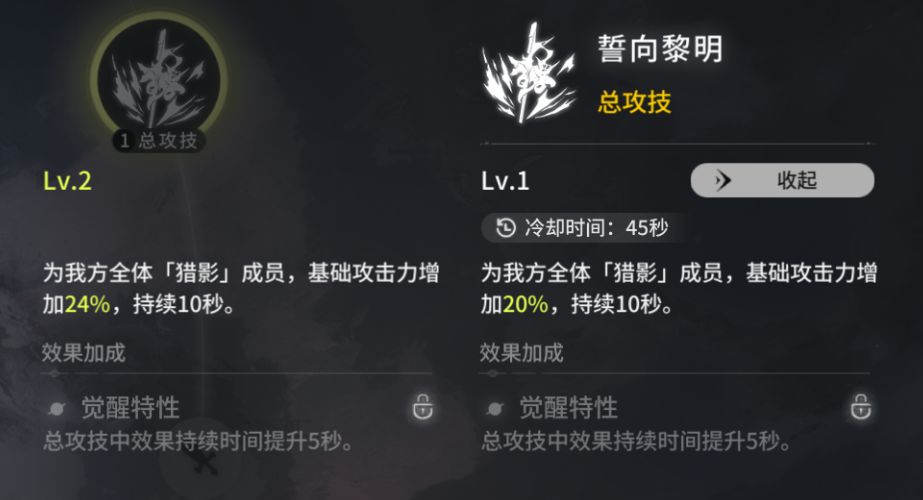 月蚀总攻技满级时,可以提升我方全体【猎影】40%的攻击,持续15秒。