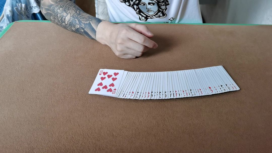 然后,魔术师将牌面朝下放在桌子上,然后让观众轻轻点一下牌堆。
