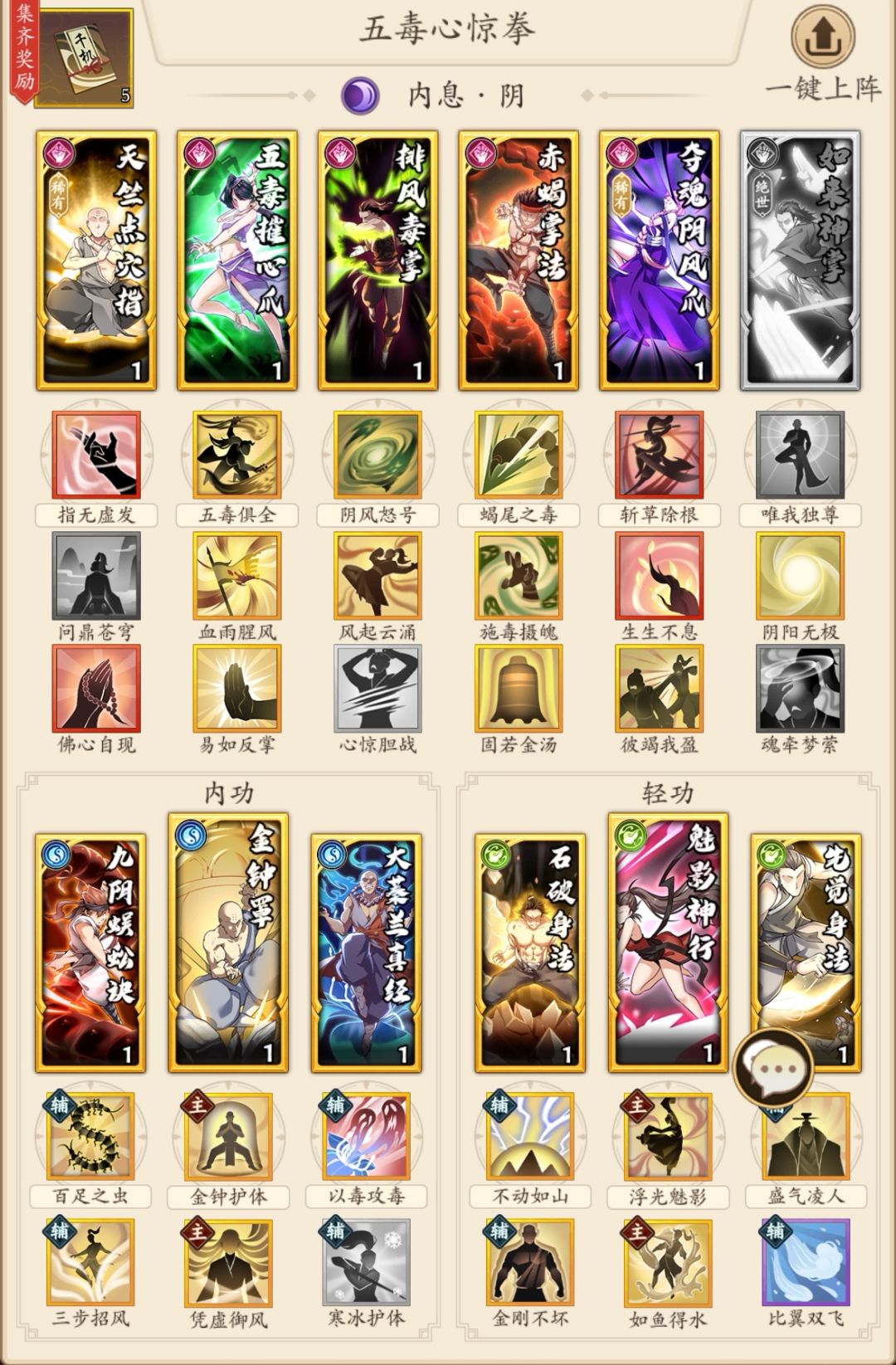 内功主:金钟罩,40%的机率格挡,在对方被毒死前让你更抗揍