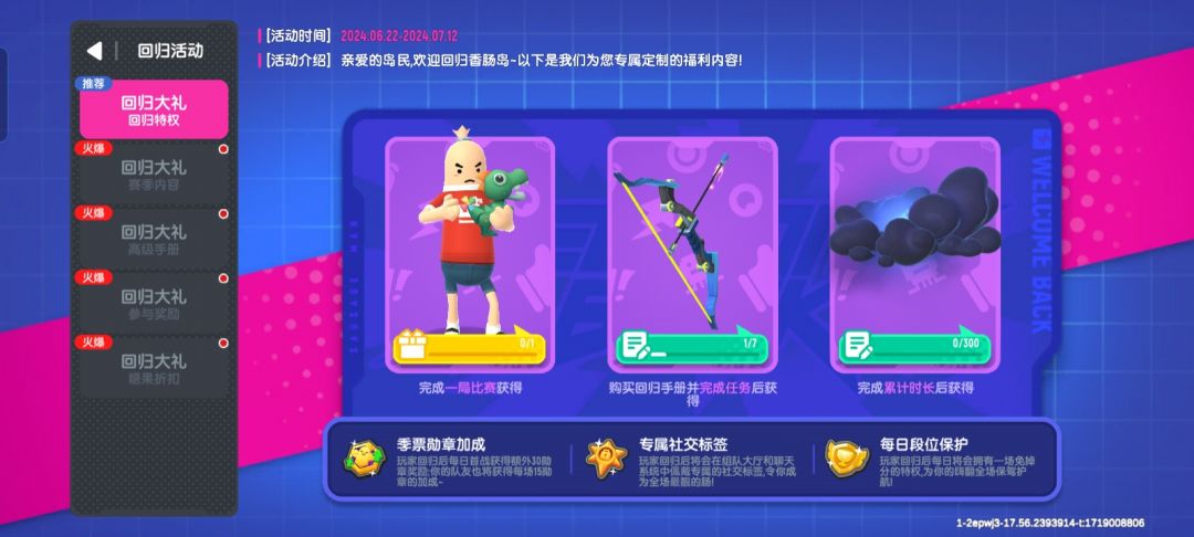 回归后会有一些特权,比如:季票勋章有加成,可让回归玩家更快的升级。还有专属的社交标志。当别人看到你的话,有好心人会带你一起打。还有每日的段位保护,刚回来的肠肠如果不适应也不怕掉分了。当然,回归还有很多福利,你完成一局比赛就可以获得特定的动作,每日签到还能获得皮肤,进行游戏也可以获得皮肤。