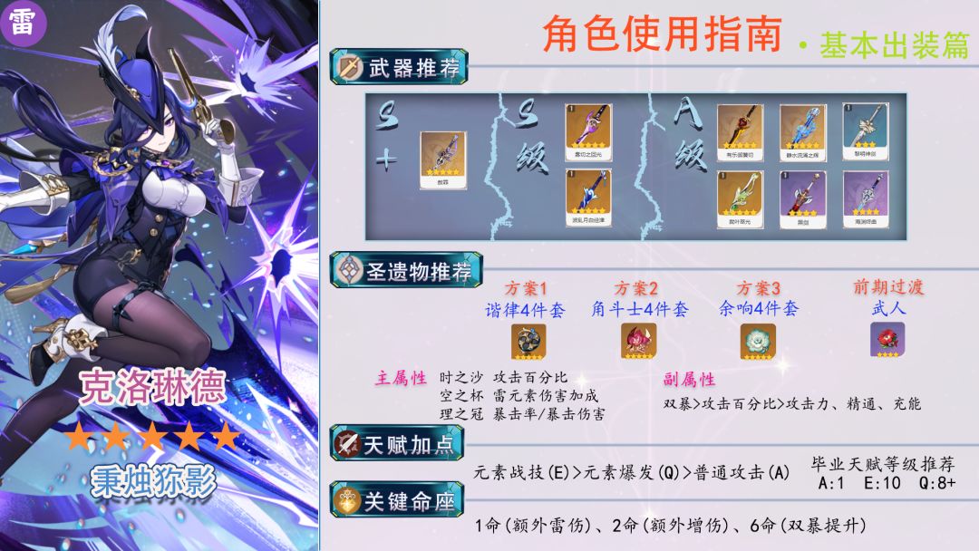 枫丹的大C主打一个品质保证,克洛琳德也是很强力的一个雷C了。枪剑结合的玩法机制,夜巡状态下的速攻也很有意思,绝对是值得抽一个的。阵容上,可以选择激绽玩法,或是结合枫丹体系,也可以搭配奥兹玩附加攻击,或是带上天空之刃玩特效流,总之花样还是很多的。