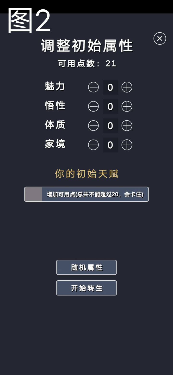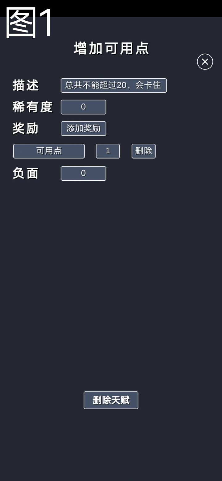 (注:图1【描述】中那个“总共不能超过20”指的是后面用天赋添加的可用点,最高可用的可用点数是40,再多的话会卡住)