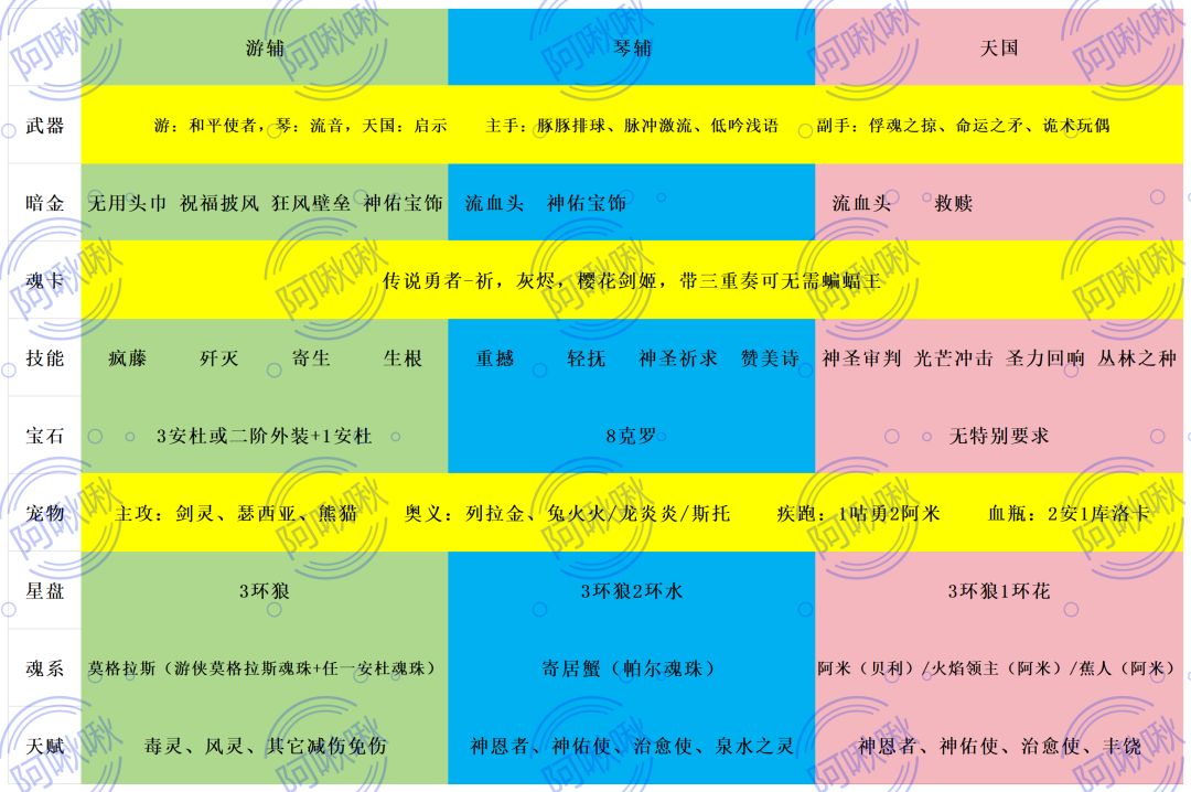 木系主C法师需要辅助【游辅】、【琴牧】、【天国】注意看文字细节,不推荐无脑照着图中的抄写,最后有此次跨服列拉金辅助推荐搭配省流版