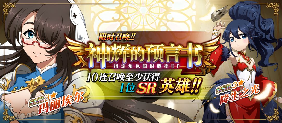 限时召唤「神辉的预言书」中SSR级英雄降生之光、玛丽埃尔出现概率提升!