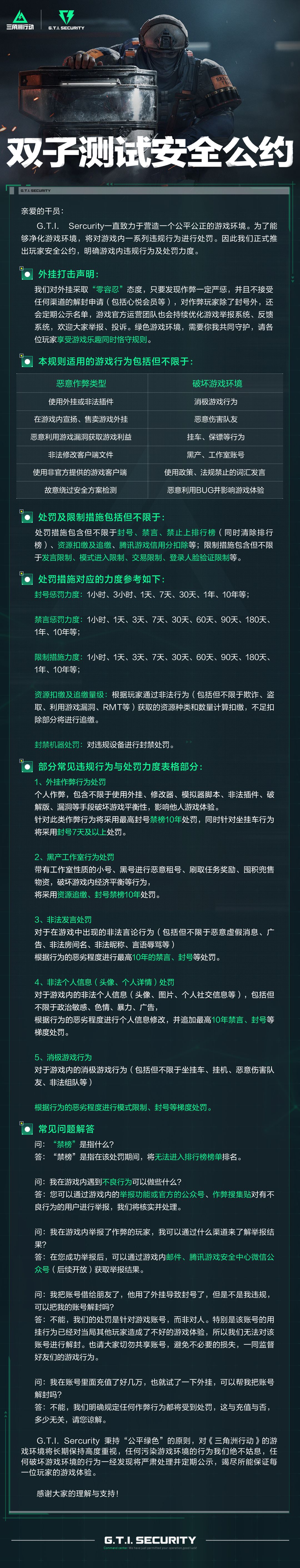 为了保障公平纯净的游戏环境,我们将对游戏内一系列违规行为进行处罚和打击。因此我们正式推出玩家安全公约,明确游戏内违规行为及处罚力度。
