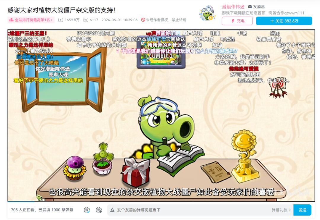 上述这段发言,源自无数玩家对于《植物大战僵尸杂交版》的热诚赞美。就在上个月,《植物大战僵尸杂交版》(以下简称《PVZ杂交版》)以常人难以想象的速度火遍全网,而制作人“潜艇伟伟迷”于B站发布的感谢视频,也在6月6日突破1000万播放,如今视频累计播放高达1600万,并且账号粉丝也同样来到380万之巨。