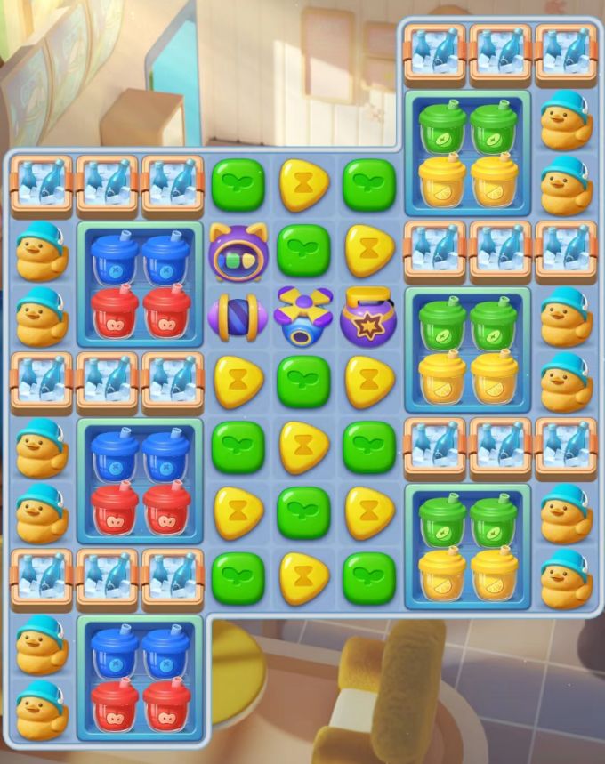 529关比之前面更加麻烦,鸭子被框在最外层触碰不到,而鸭子消除完还有大片沙地需要处理。本关优先使用的依然是“炸弹”,无论是“炸弹+螺旋桨”还是“炸弹+火箭”效果都很好,如果合出“超级智脑”则尽可能配出“螺旋桨+炸弹”,要尽快用更少的步数将汽水箱和冰桶炸掉,最后集中处理鸭子与沙地即可。
