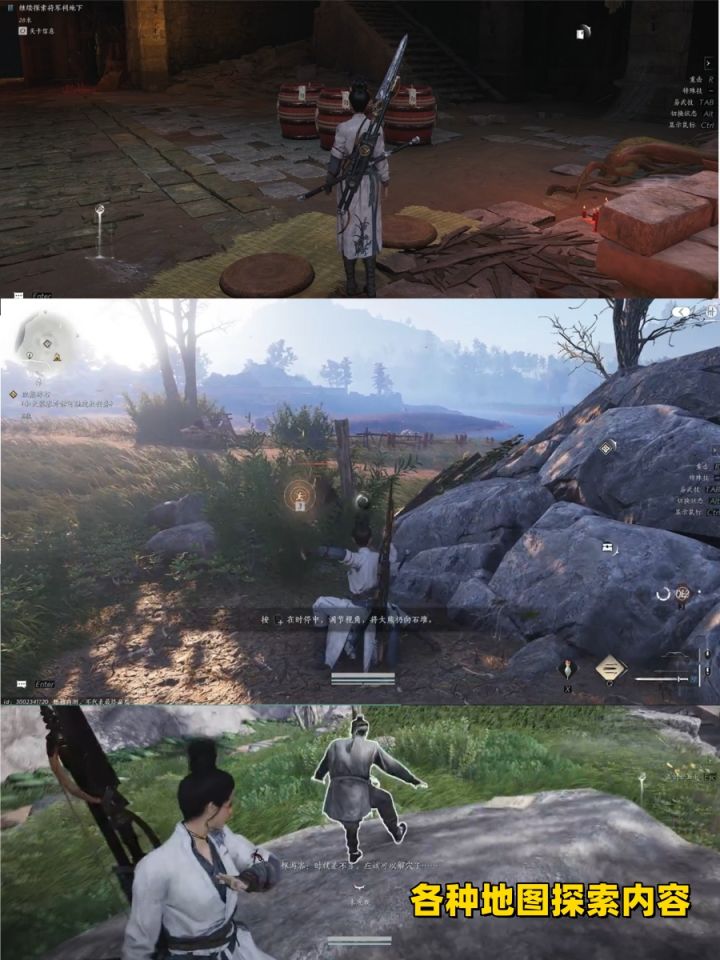 说起副本刷取,那就不得不谈谈这款游戏的战斗设计了,战斗采用类魂一样的操作,但难度上降低不少。你可以在敌人攻击落下的瞬间使用格挡,抵挡敌人的攻击,同时大部分武器(除了扇子之外),都存在F控制的格挡反击。每个武器都设定了主动技能、重击、连招等设计,可以说,自由组合的武侠招式,倒是一个不错的亮点。而在场景交互上,游戏呢,也意外地加入了开放世界的地图探索内容,比如各种偷师的宝箱、秘窟、藏宝地等等,你可以借由一些线索,找到这些场景,解谜也存在一定的技巧,比如点穴、跳跃翻墙等。