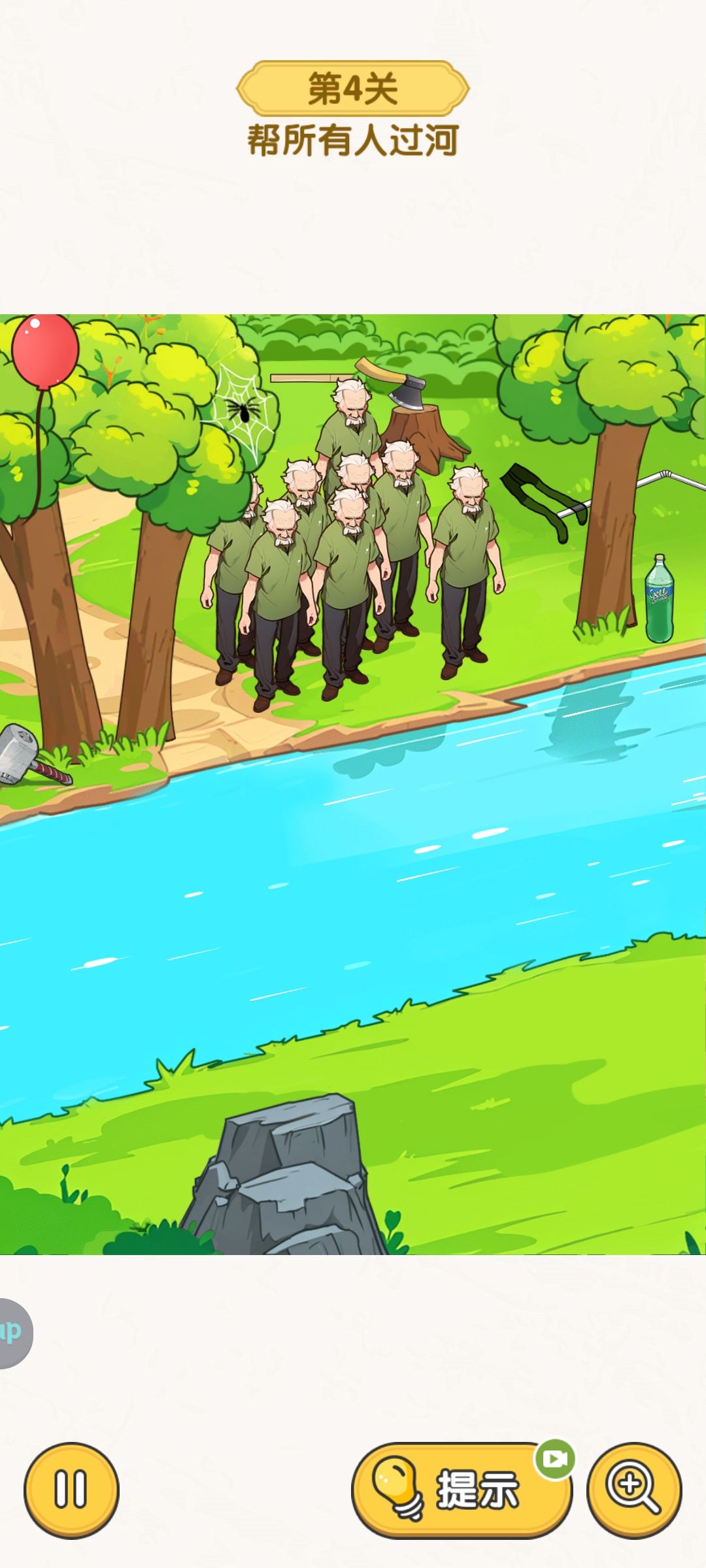 裙子,吸管,斧头砍树,气球,杆子,蜘蛛,摇晃汽水,锤子敲石头后出现的剑,裤子拖到两棵树中间。