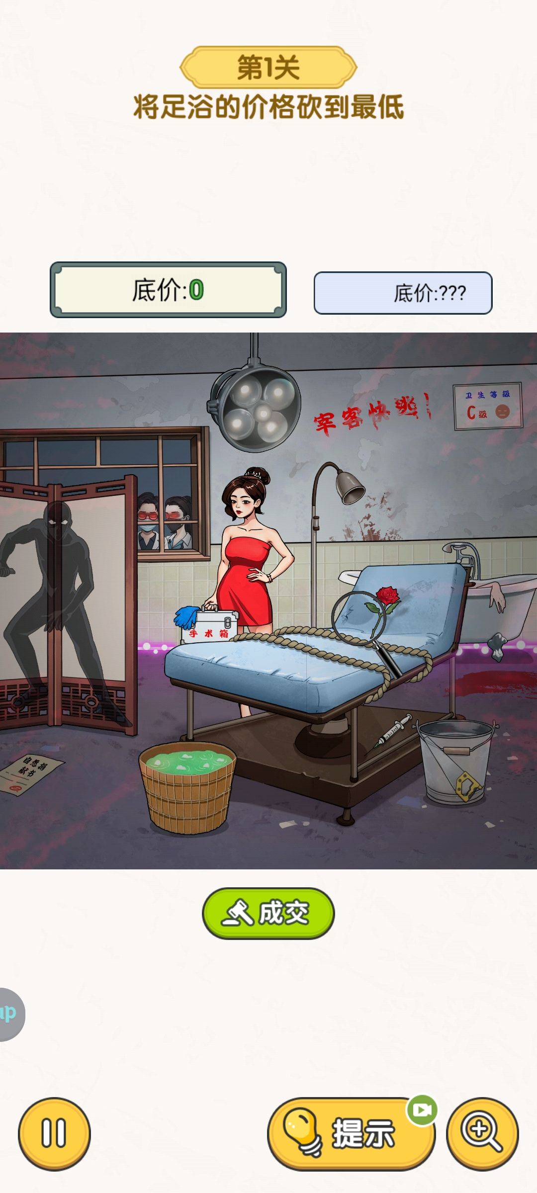 石头放马桶,锤子敲窗户和女人腿的石膏,扫把给猪,火柴给火堆,水桶给猪,空盆捉苍蝇再煮一下给猪吃,毛巾擦蘑菇,蘑菇和饭盆给女人,猪给女人并盖上被子和禾秆草草堆。