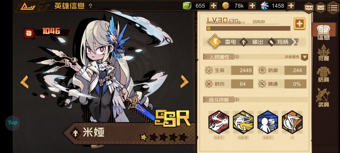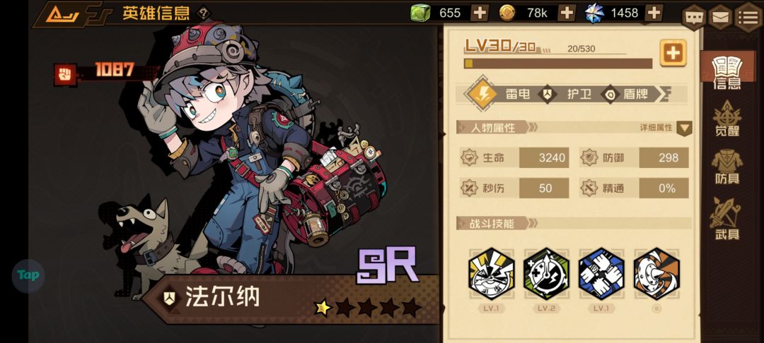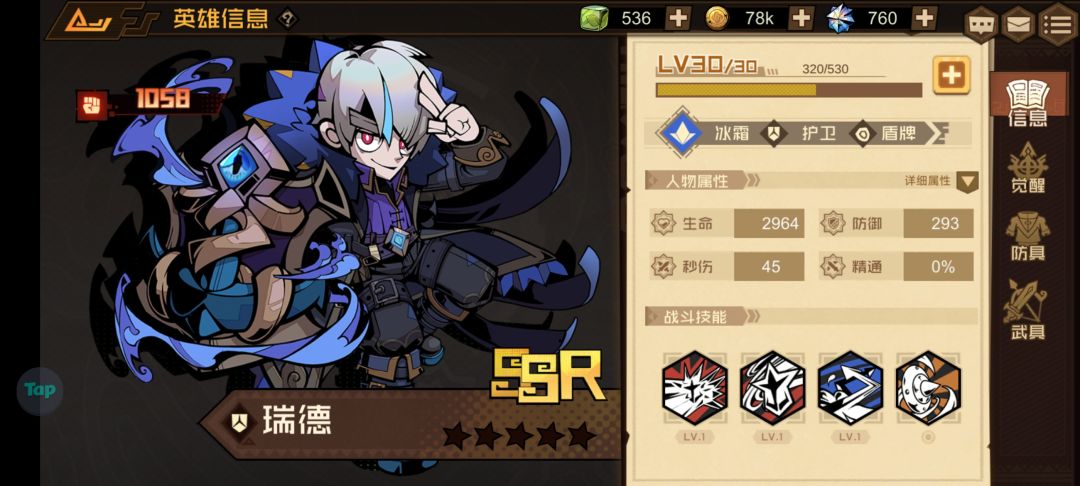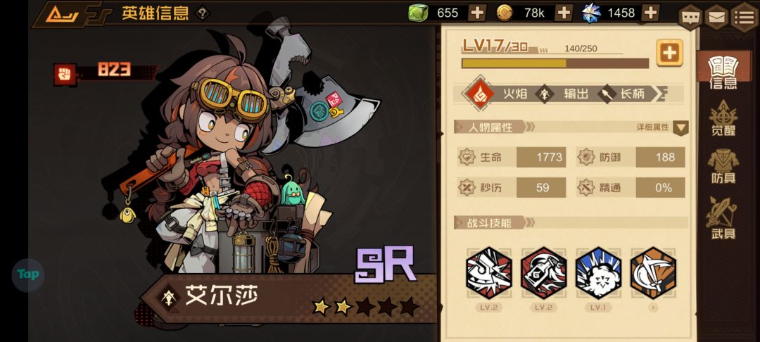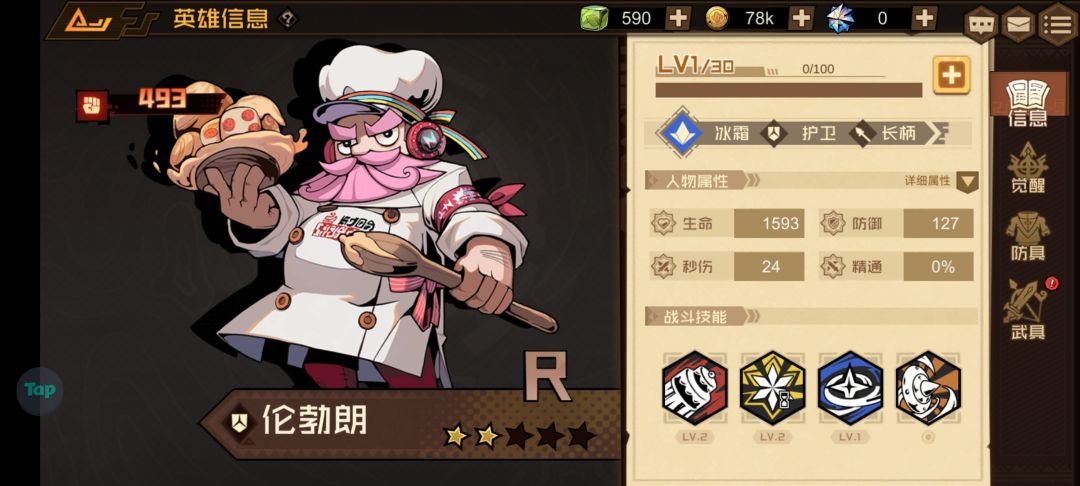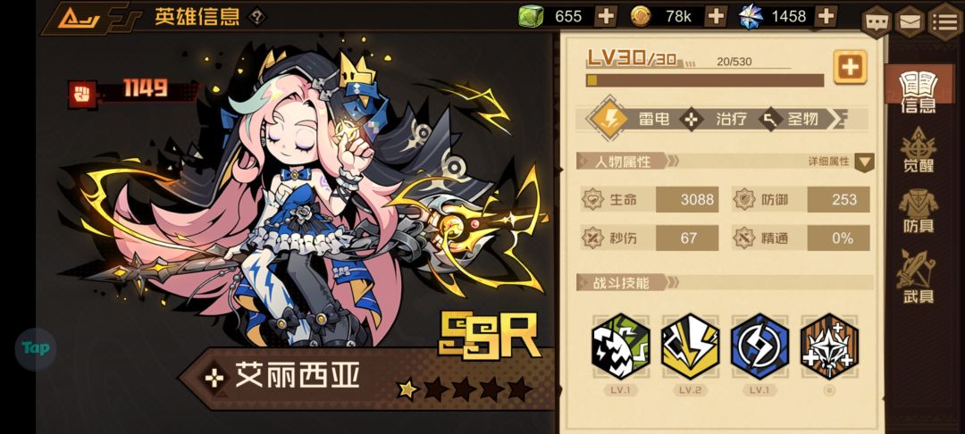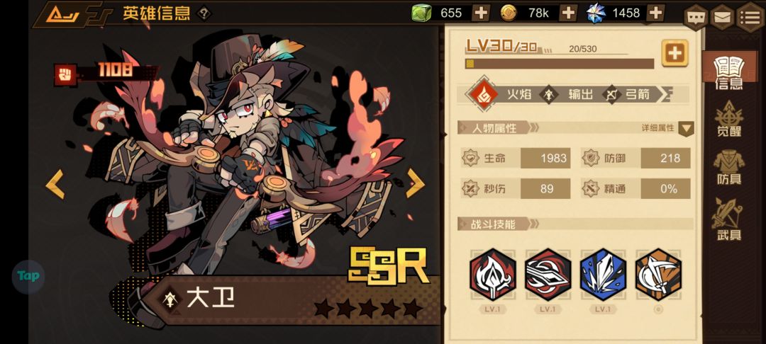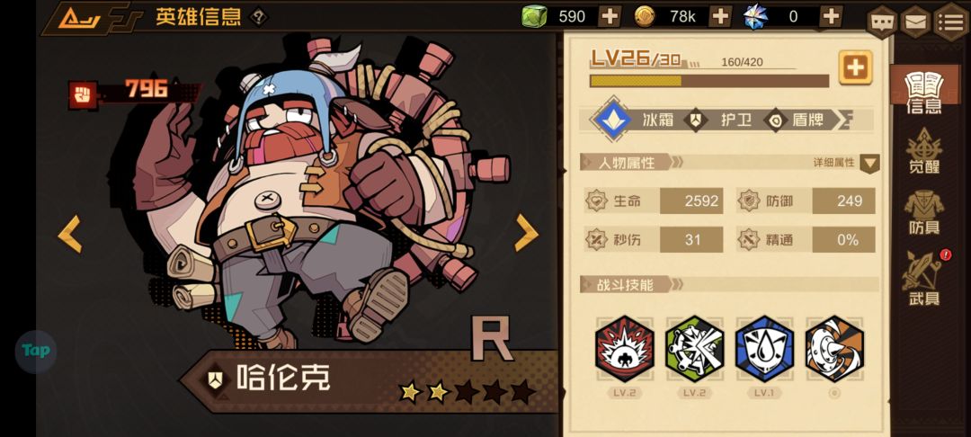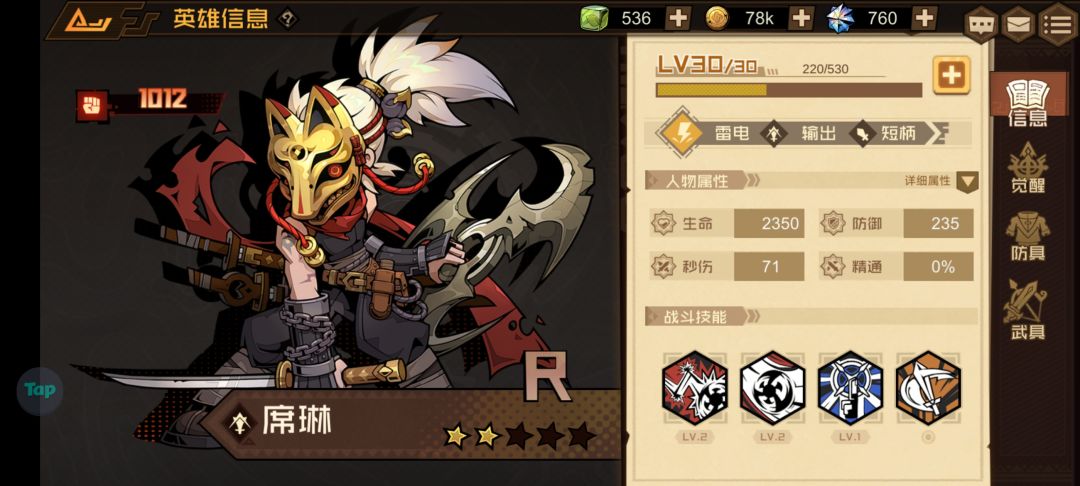 为什么说它性价比很高呢?因为它只是一个R级英雄,就是说我们抽奖是很容易获得的,你看我随便抽了个三十发就到两星了,所以是很好养的,按前期来说综合强度是四分,加上按性价比来说就是五分