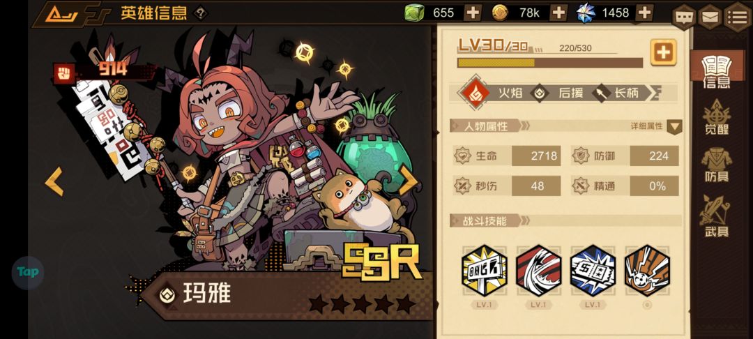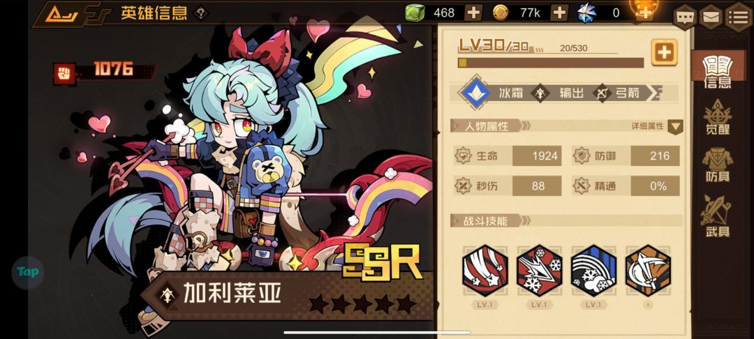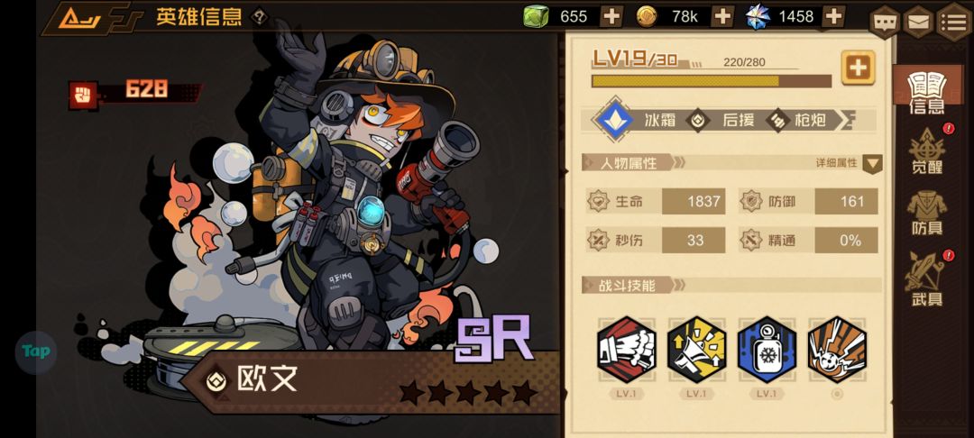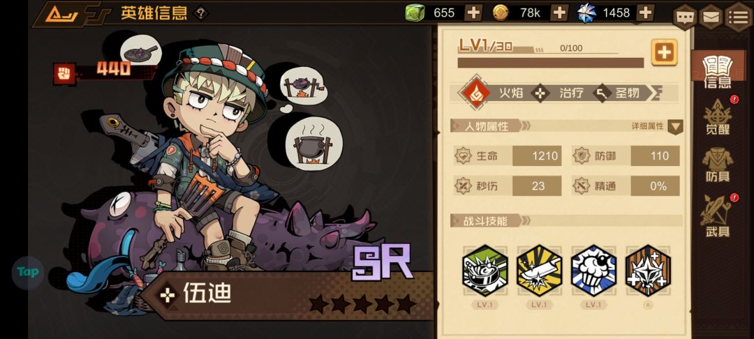 大招是展开摊位给队友进行增益增伤或者增免伤,被动式击退敌人,回复能量,这是一个典型的搭配型英雄,从各方面数据来看,单个实用性并不强,按照性价比来说的话,前期如果抽到了,根本就没啥用,如果你前期数值都很低,那些免伤和增伤是没啥意义,该秒还是被秒,这个就是我第一个抽到的ssr英雄只能说是前期对于打关来说没什么帮助,但放到后期跟其他英雄打搭配强度或许还行,像是大卫米娅伤害高一点的英雄,所以强度给出三