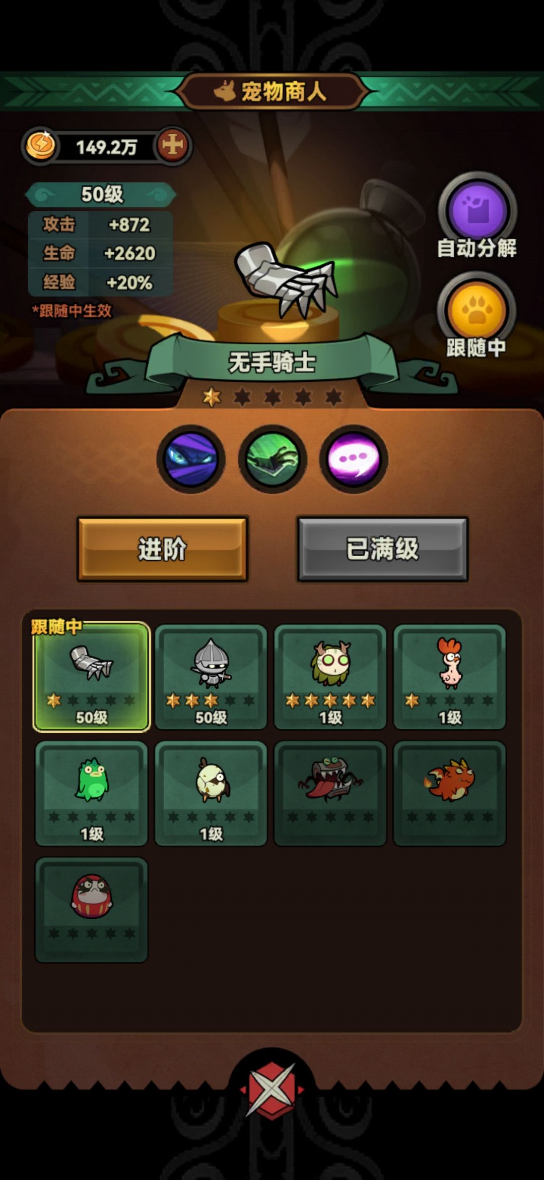 宠物选择:绑定无手骑士,没有的话随便哪个都行。