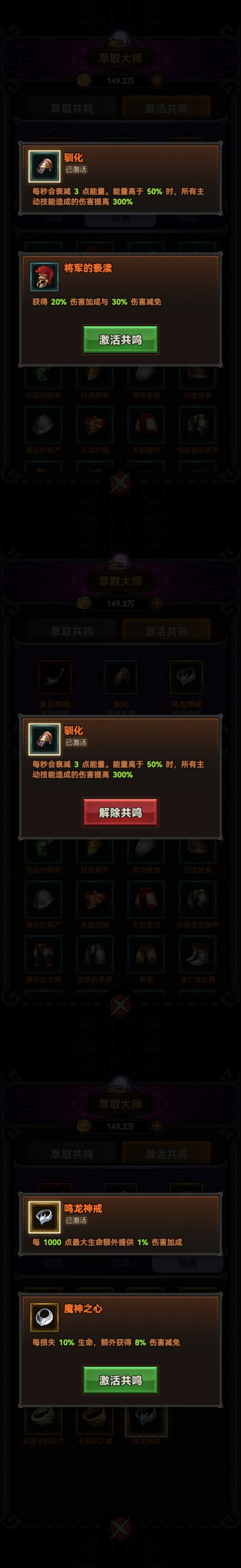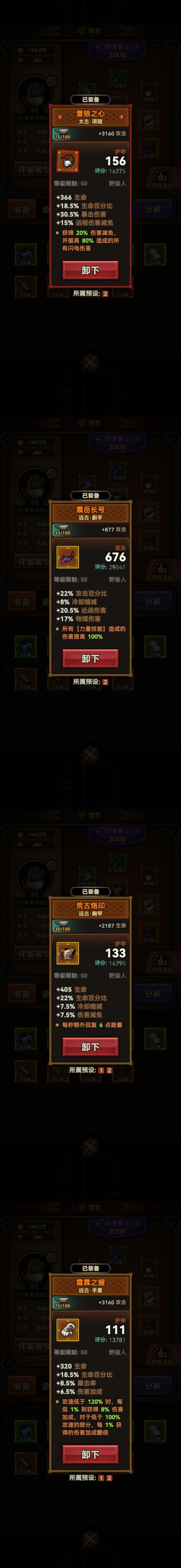 手套:霜霖之握(绑定无手骑士宠物,注意把装备上的攻速词条洗掉!!!没有的话随便哪个宠物都行,手套换成驯化,把将军的亵渎换成荒古烙印,这种搭配伤害和坦度均没有前者高)
