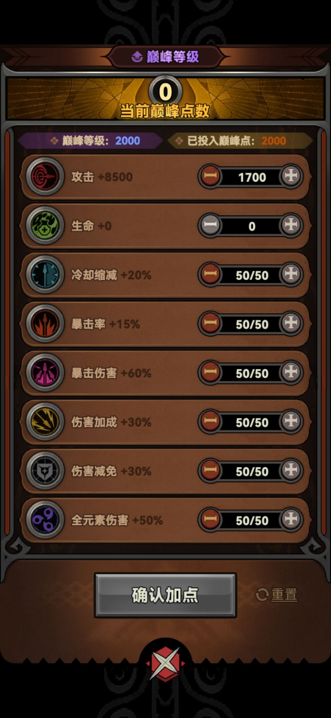 巅峰属性选择:减伤-两个伤害加成-暴击暴伤-冷却-攻击