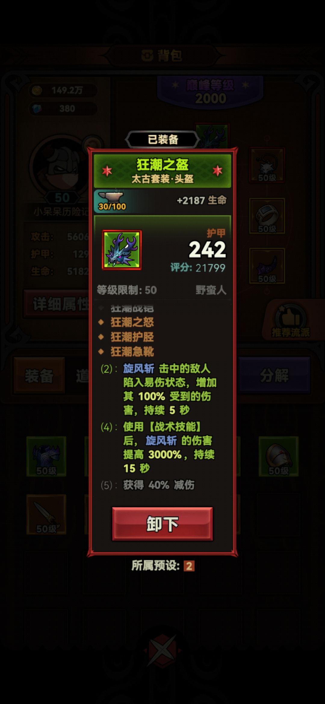 这个阶段是我们刚凑齐狂潮套装,还没有远古防具,血量很低的阶段。因为野蛮人的近战硬伤,所以我们需要尽可能的把生存顶起来。在这个阶段,我们舍弃了驯化和荒古烙印的组合,而是选择不灭战铠和将军的亵渎,来大幅提升我们的坦度。