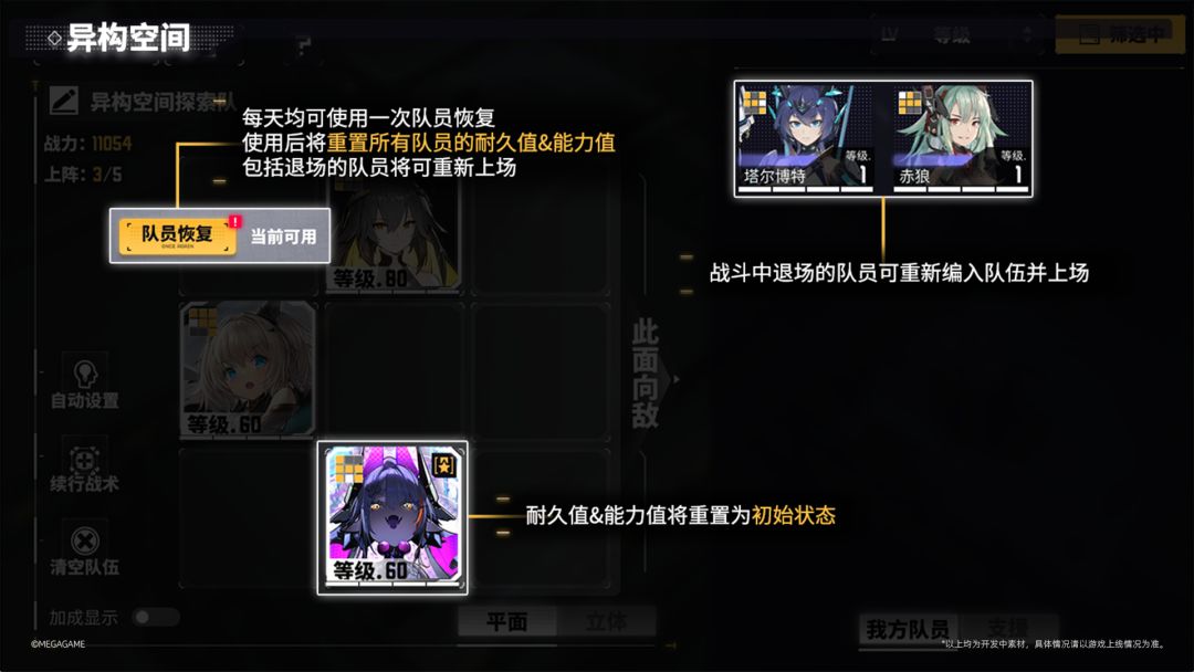 ※活动期间每天可使用一次队员恢复,使用后将重置所有队员的耐久值&能力值,包括退场的队员将可重新上场