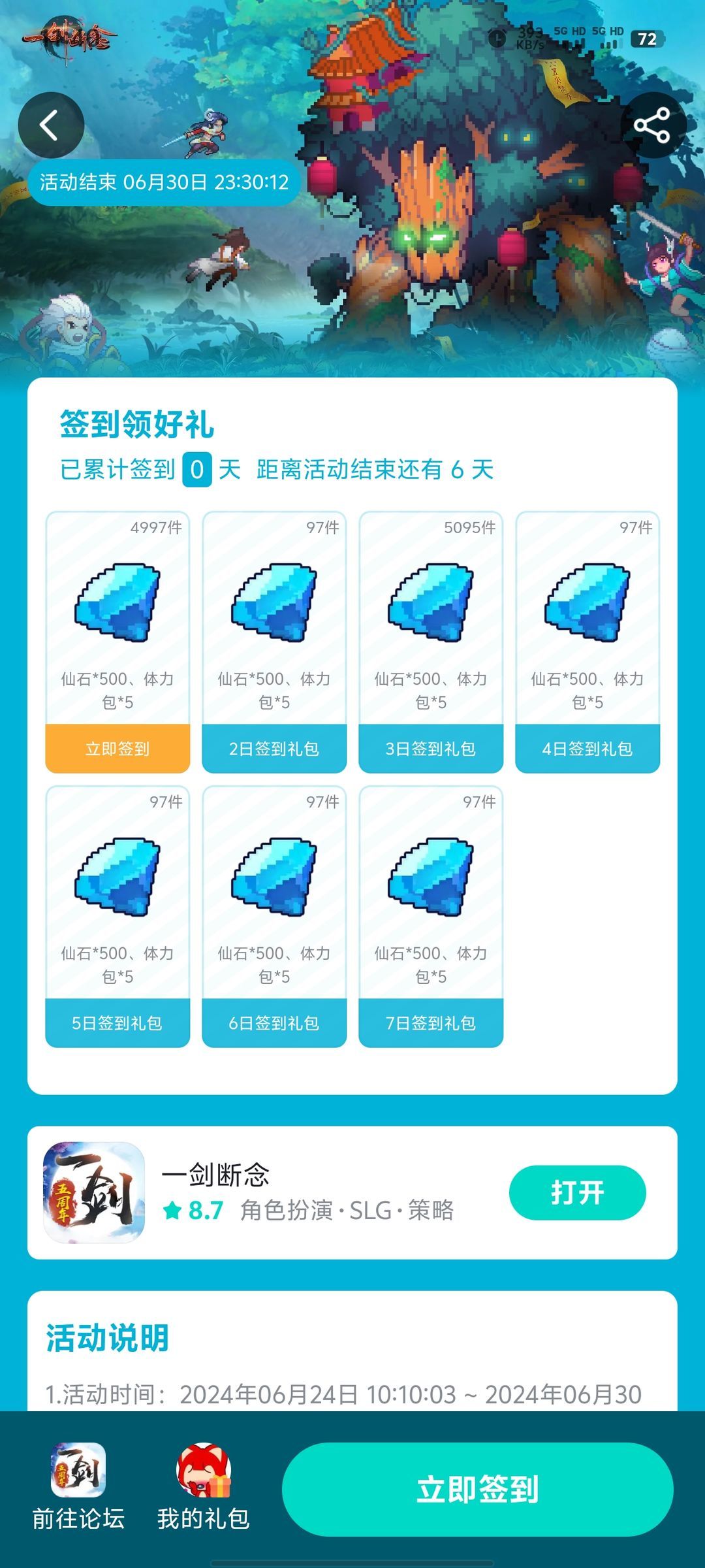 活动说明1.活动时间:2024年06月24日 10:10:03 ~ 2024年06月30日 23:30:12点击签到有礼。