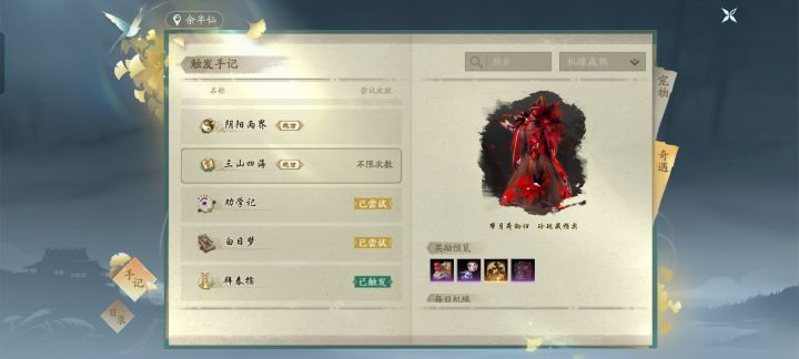 奇遇系统,一个鉴别是不是黑鬼的系统,首先想触发奇遇必须满足特定的前置,大部分的奇遇都可以看得到前置,平时没事就慢慢凑前置吧!凑齐之后跟触发方式每天去碰瓷。另外还有宠物奇遇,每个宠物每天摸三次概率触发,准备好除智散一个个摸吧!