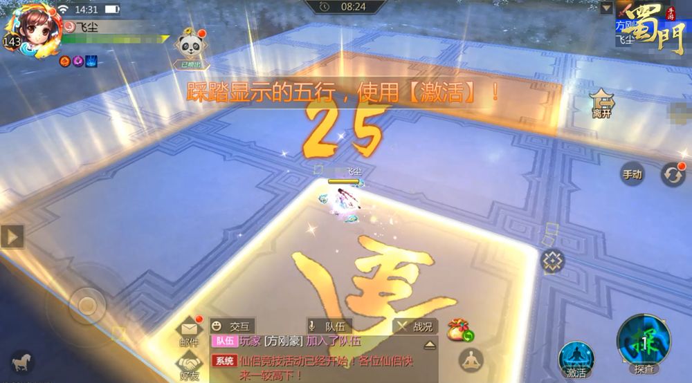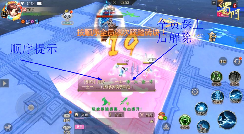 应对方法:此时在屏幕靠下的地方会出现顺序的提示,先看提示,后找到第一个方块,需要由全员一起踏上这个方块就可以激活这个方块了,后依次按照给出的顺序激活4个带有五行的方块。