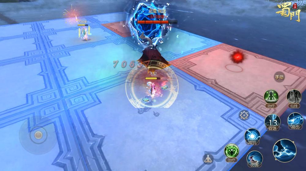 如下图所示,在这16个小方块中,应尽量将红色破碎的方块控制在靠近边缘的3-4个方块内,红色的方块越少,越容易通关这个BOSS。整场战斗中,所有成员包括武尊也都应站在靠近红色破碎方块旁的蓝色方块上,方便快速的处理技能。