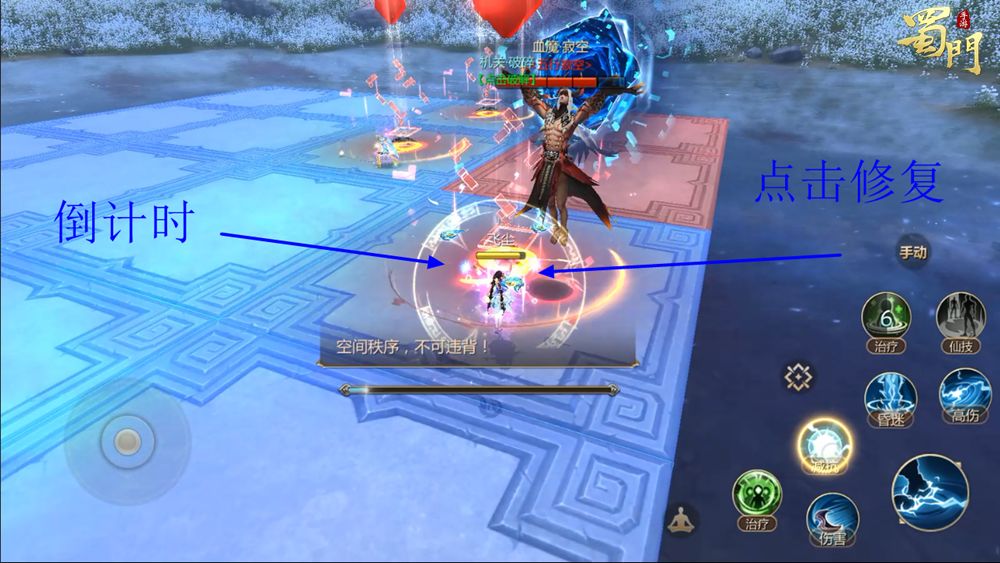 应对方法:靠近并点击机关,就能将机关转变为修复机关,修复机关可以立即使周围前后左右所有的红色方块变为蓝色。同时还会给采集的角色赋予小幅度加速和攻击力提升,持续数秒。此时的BOSS是没有动作的,所有成员应全部动起来去解除场上的机关。